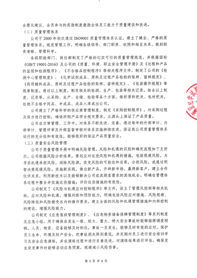 《南京化學(xué)試劑股份有限公司質(zhì)量信用報(bào)告》回顧了南京化學(xué)試劑在質(zhì)量管理、產(chǎn)品質(zhì)量責(zé)任、質(zhì)量誠(chéng)信管理等方面的方針、制度、措施及取得的成效。關(guān)于報(bào)告的內(nèi)容,說(shuō)明如下: